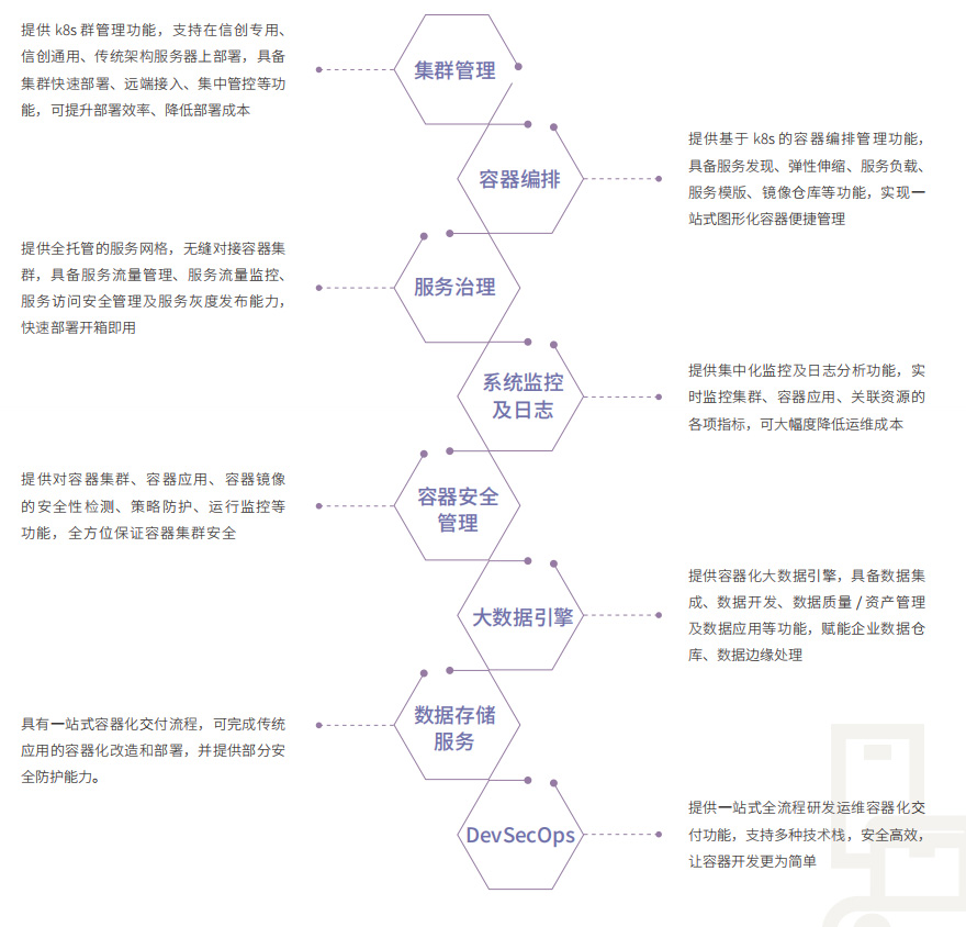 面向信創(chuàng)云、專屬云、混合云架構,具備多云管理、容器編排、服務治理、DevOps、數(shù)據(jù)存儲、大數(shù)據(jù) 中臺等業(yè)務功能。提供一站式企業(yè)云原生平臺解決方案 , 全方面助力企業(yè)業(yè)務云原生化,實現(xiàn)快速數(shù)字 化轉(zhuǎn)型升級。